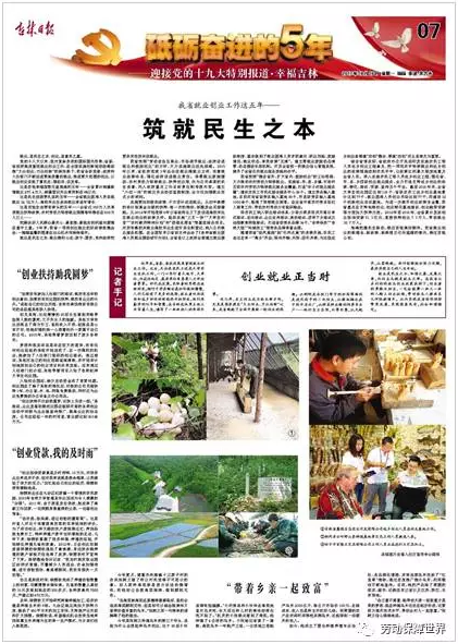 编者按:10月16日,《吉林日报》“砥砺奋进的五年”专版聚焦我省五年来的就业创业工作,发表了综述文章《筑就民生之本》,并以《创业就业正当时》为题撰写了“记者手记”,《创业扶持助我圆梦》《创业贷款,我的及时雨》《带着乡亲一起致富》等3篇文章及相关图片(我厅宣传中心提供)全面深刻地呈现了我省围绕“两确保、一提升”工作主线推进创业就业工作所取得的优秀成果。