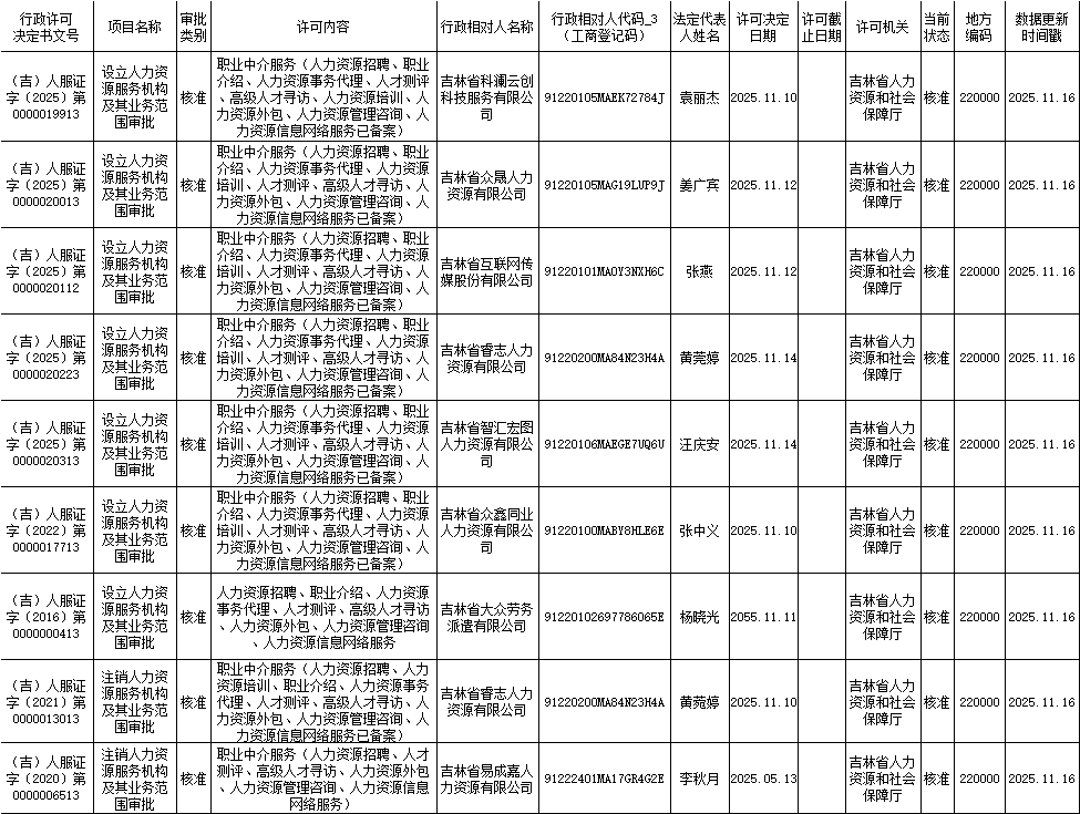 设立人力资源服务机构及其业务范围审批公示信息(2025年11月10日至2025年11月14日办理)