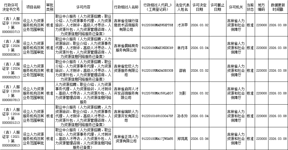 设立人力资源服务机构及其业务范围审批公示信息(2026年03月02日至2026年03月06日办理)