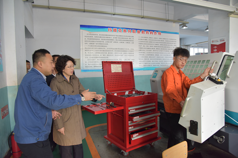 在长春医药化工工业技术学校实训基地调研期间,吴兰厅长实地查看了数控铣工、数控车工实训等教学设备,同长春市人社局及学校有关领导、教师、学生进行了现场交流及座谈。调研中,吴兰厅长听取了学校当前培训中存在的实际困难,并进行现场办公,同随行人员研究了初步解决措施,并叮嘱随行人员迅速细化问题清单、深化调查研究、推动问题解决,切实推动职业技能提升行动落实落地。